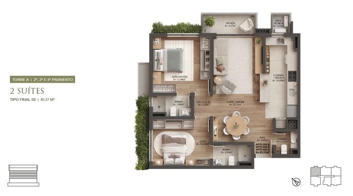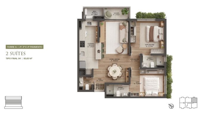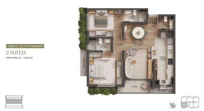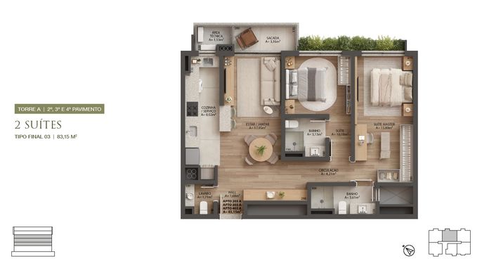 Cada torre com: 24 apartamentos de 1, 2 e 3 suítes e 5 lojas.
