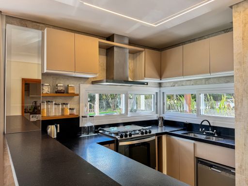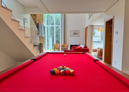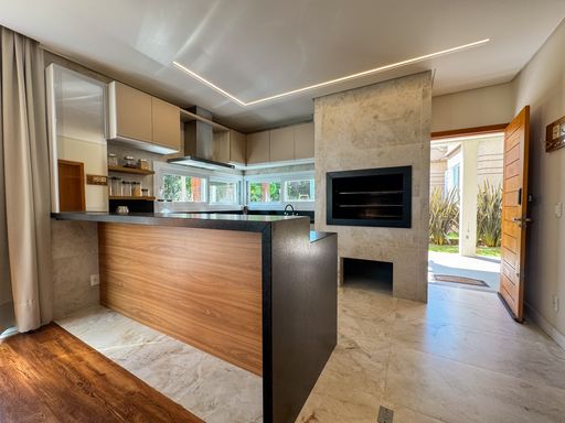 A cozinha com churrasqueira proporciona convivência entre todos, nos momentos de cozinhar, pois está totalmente integrada a sala de jantar e a sala de estar que por sua vez possui lareira, pé direito duplo e janelas do teto ao chão, envolvendo a família e amigos numa verdadeira contemplação a natureza de frente ao jardim. Ainda, ligado a sala de estar encontramos uma sala de jogos com lavabo.