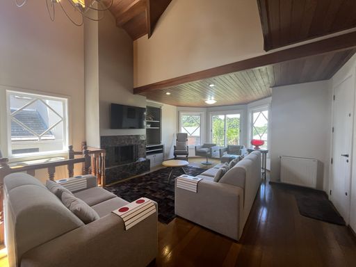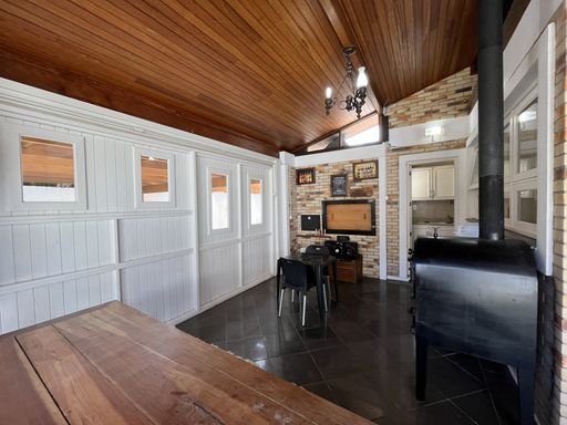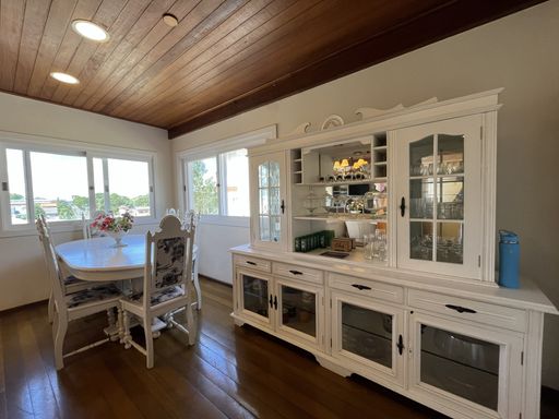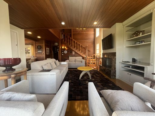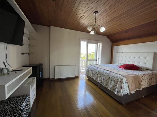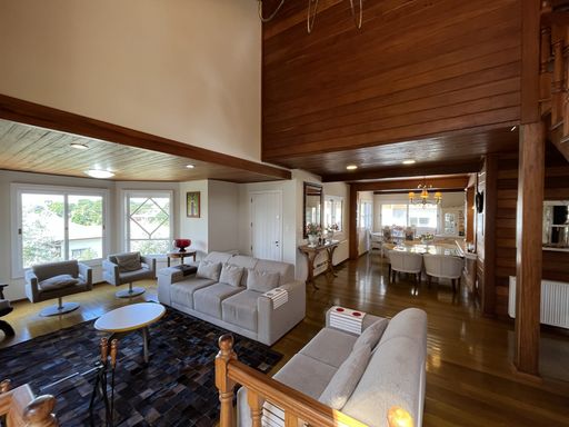 Ao entrar, você é recebido por uma varanda linda com vista, e uma sala de estar imponente e ampla com lareira, integrada à sala de jantar, criando um ambiente perfeito para receber amigos e familiares. O andar conta ainda com uma suíte térrea, ideal para hóspedes ou moradores que buscam maior acessibilidade. A cozinha conecta-se à sala de jantar, e a mesma a uma área gourmet com churrasqueira e fogão campeiro, dando acesso a area de serviço e quintal externo, um verdadeiro refúgio para momentos de lazer.
